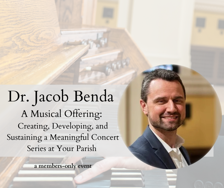 In this one-hour session, Dr. Jacob Benda will give helpful guidance on creating, developing, and sustaining a meaningful concert series at your parish or institute.
